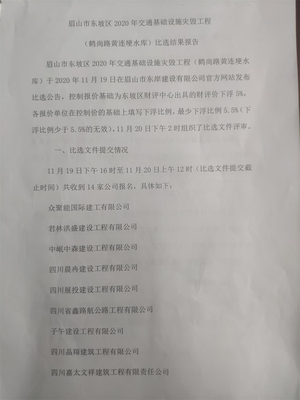 眉山市東坡區(qū)2020年交通基礎(chǔ)設(shè)施災(zāi)毀工程(鶴尚路黃連埂水庫)勞務(wù)隊(duì)伍比選結(jié)果